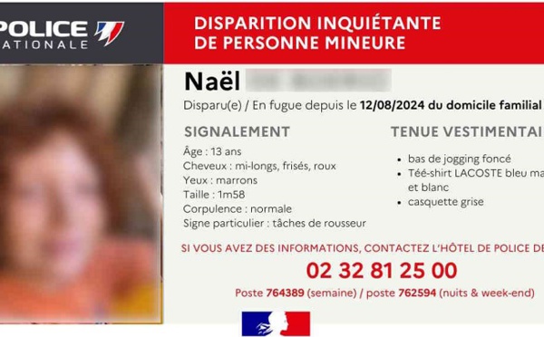 En fugue depuis le 12 août, Naël, 13 ans, a été retrouvé sain et sauf annonce la police de Rouen - Publié le 14/08/2024