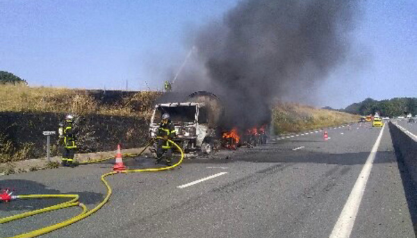Un camion-citerne transportant du lait a pris feu ce matin alors qu’il circulait sur l’A150 en direction de Rouen. Les flammes se sont propagées aux abords de la chaussée, générant un panache de fumée