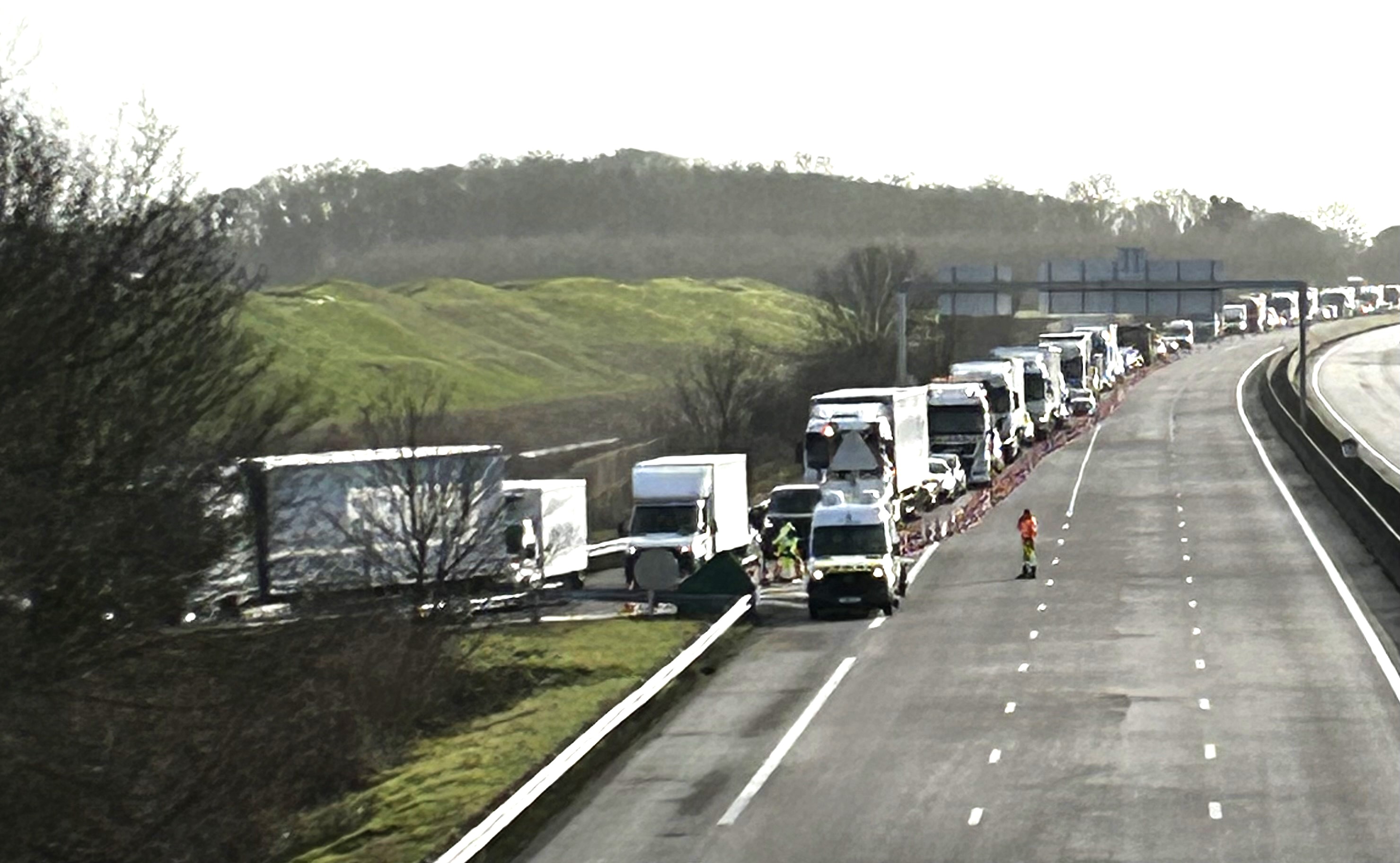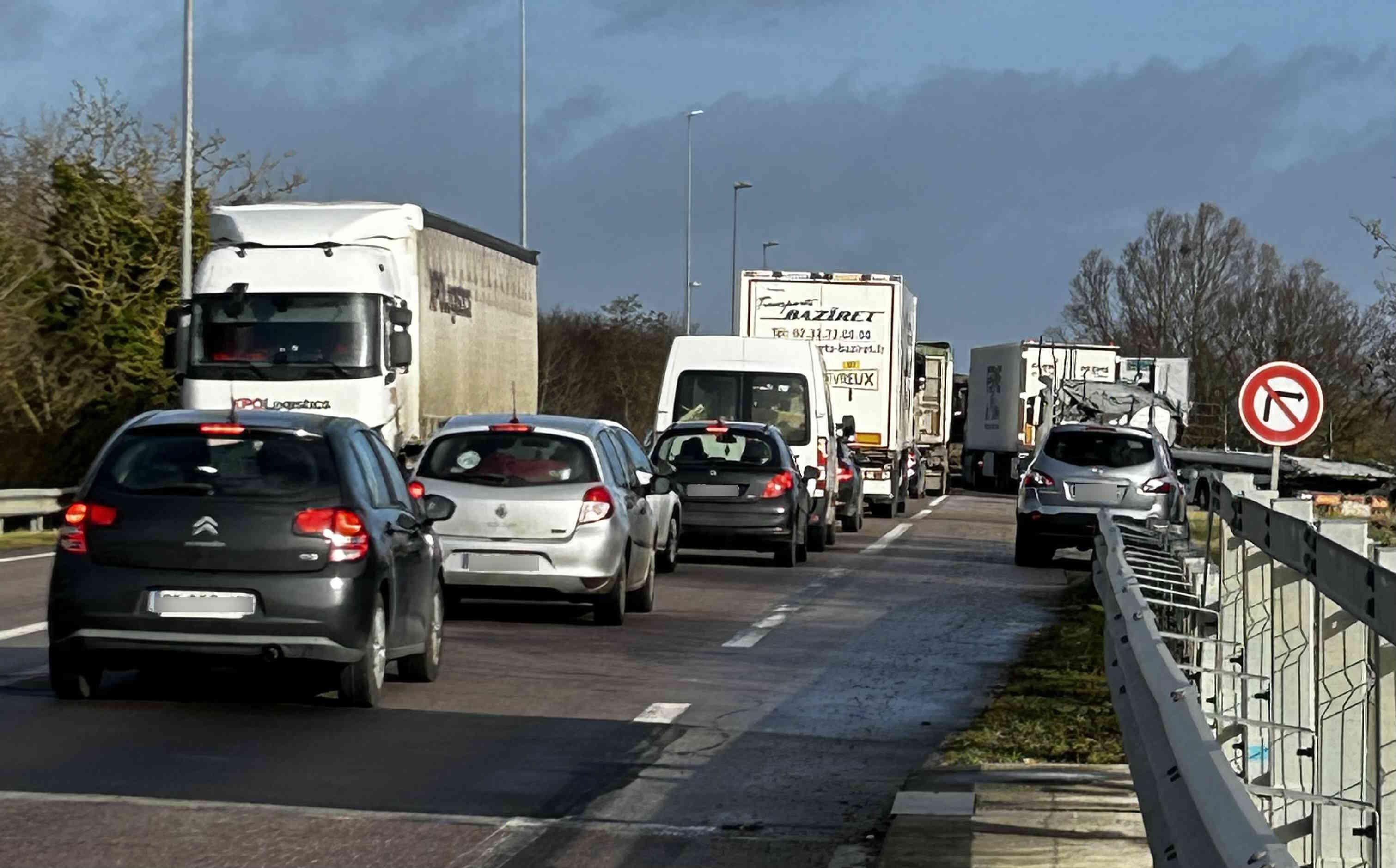 Photo du bas. Le rond-point de la Heunière sur la D181 était complètement bloqué ce matin en raiuson de la fermeture de l'autoroute - © infonormandie.com