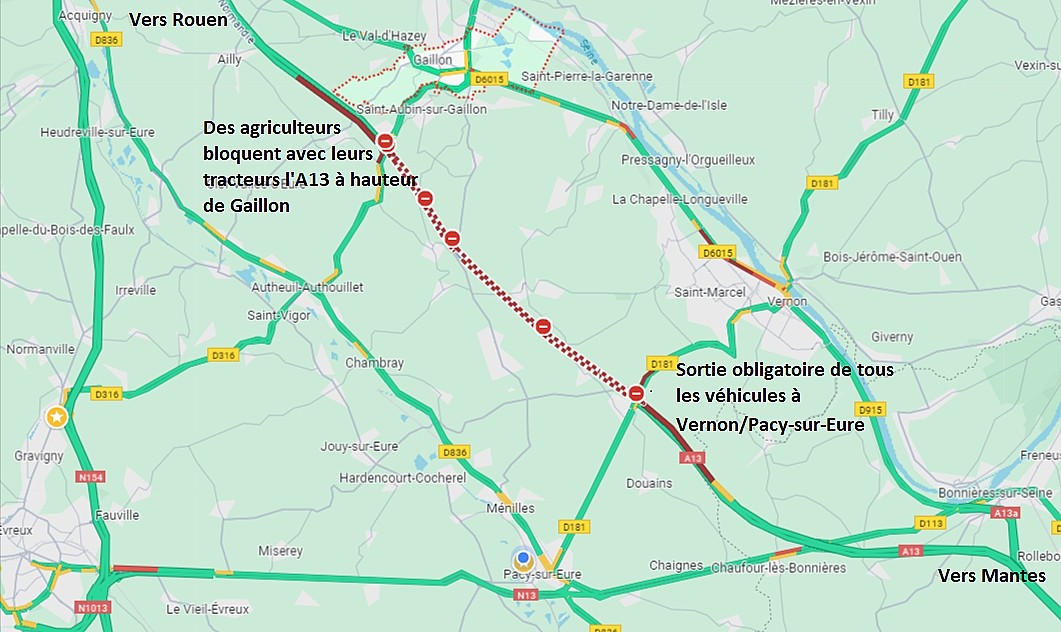 L'autoroute A13 est coupée à la circulation dans l'Eure. Ce mercredi matin, vers 10h30, des agriculteurs ont mis en place un blocage à hauteur des sorties 16 et 17, près de Saint-Aubin-sur-Gaillon et de Douains, dans les deux sens de circulation. Une vingtaine de tracteurs sont sur place.