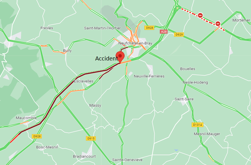Une déviation a été mise en place par l'échangeur du "Four Rouge". Il est possible de reprendre l'A28 à l'échangeur "Pays de Bray".