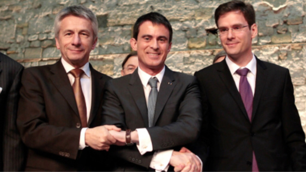Laurent Beauvais et Nicolas Mayer-Rossignol entourent Manuel Valls lors d'une récente visite du Premier ministre en Normandie (photo : gouvernement.fr)