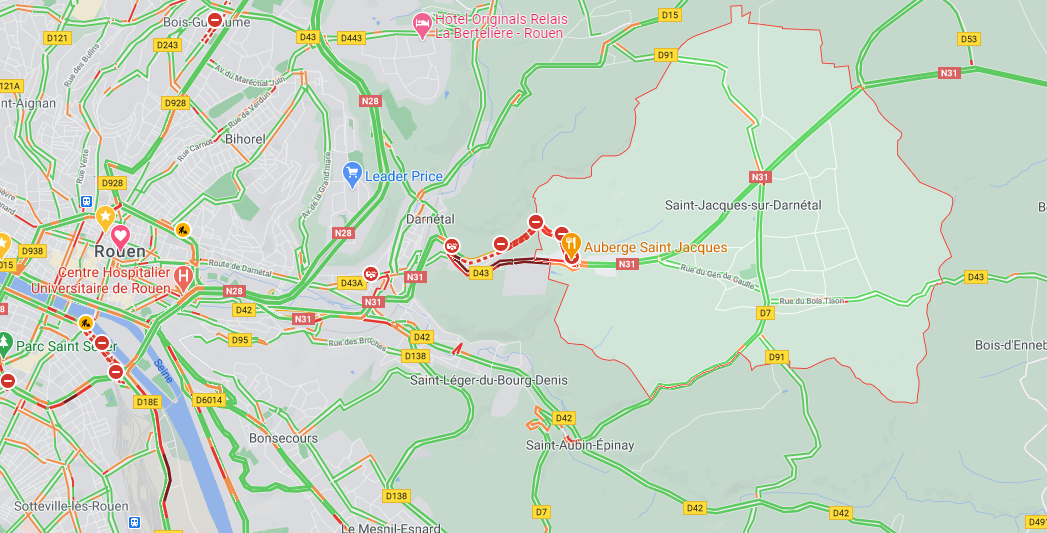 La N31 (route de Gournay) est coupée à la circulation dans les deux sens à hauteur de Saint-Jacques-sur-Darnétal, en Seine-Maritime. Un accident matériel impliquant un poids lourd s’est produit ce lundi en milieu d’après-midi (vers 15h30) dans le sens Rouen - Beauvais.