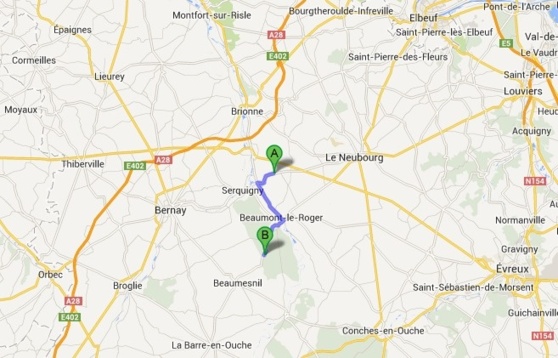 Le corps a été découvert en forêt de Beaumesnil (B), à une dizaine de kilomètres de Goupillières (A) où la quinquagénaire vivait épisodiquement avec son compagnon (@Google Maps)