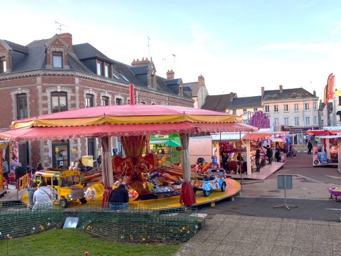 Le marché hebdomadaire de la place René Tomasini à Pacy-sur-Eure a cédé sa place aux manèges et autres stands de la fête foraine.