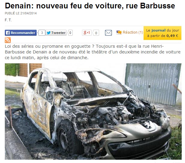 La nuit précédente, les pompiers étaient intervenus dans la même rue Henri-Barbusse : une Opel Corsa garée à trois cents mètres de là, avait subi le même sort. Les flammes avaient même endommagé une Renault Scénic stationnée juste à côté, ainsi que deux volets en PVC du rez-de-chaussée de l’EHPAD (établissement hospitalier pour personnes âgées dépendantes).