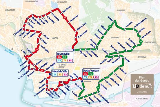 Ce service fonctionnera tous les jeudis, vendredis, et samedis soir de minuit à 5h00 du 4 juin au 31 octobre 2015. Il vient en complément du service de soirée qui aujourd’hui s’arrête vers 23h pour les derniers bus et minuit pour le tram.