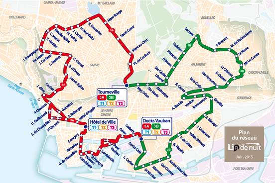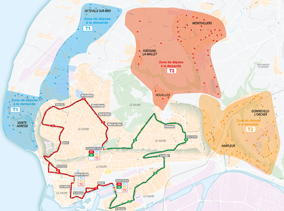 Le fonctionnement de 2 lignes de bus desserviront les quartiers les plus denses du Havre et un service de taxis affrétés assurera des départs à heure fixe vers six communes périphériques.