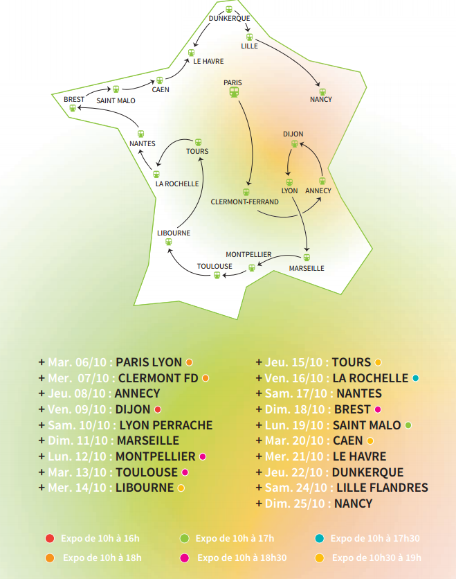 Le Train du Climat, labellisé par le Comité interministériel de la COP21, fera étape dans 19 villes de France, dont Caen (le 20 octobre) et Le Havre (le 21 octobre) .