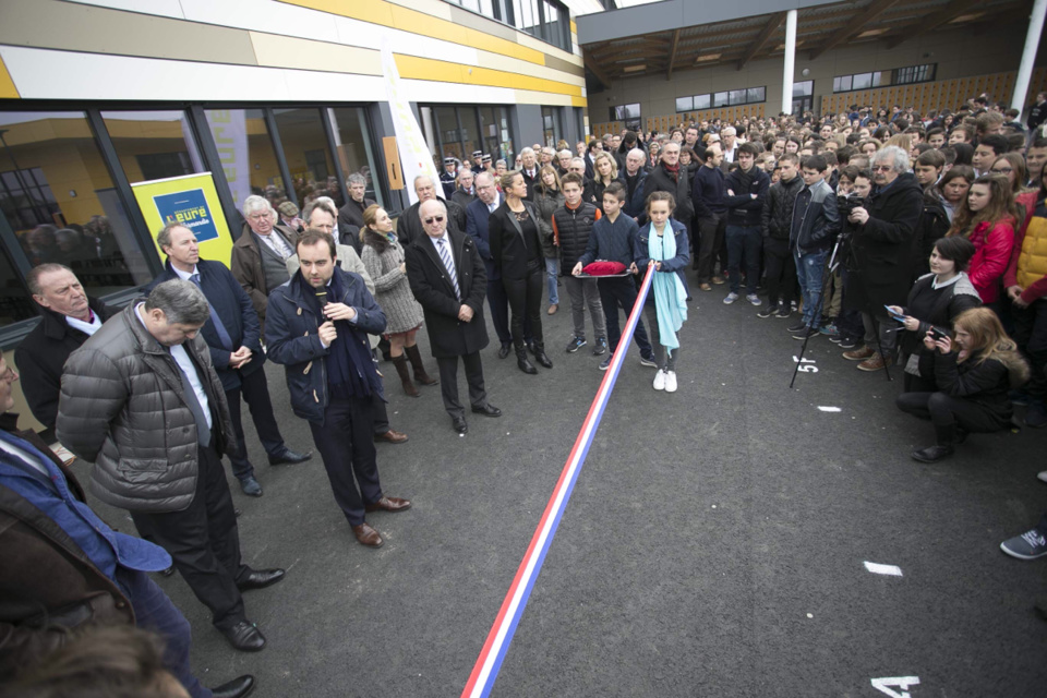 « Liberté, égalité, fraternité :« Ce collège représente un triple succès : un succès citoyen d’abord et dans les circonstances troublées que l’on connaît ce n’est pas le moindre, un succès bâtimentaire avec un investissement de 15 millions d’euros qui a profité en quasi-exclusivité à des entreprises locales et régionales et enfin un succès pédagogique, l’éducation des collégiens étant plus faciles à réussir dans un environnement propice et favorable », souligne à son tour le président du Département, Sébastien Lecornu avec à ses côtés, Pierre-François Veil, le fils de Simone Veil dont le nom est maintenant associé au nouveau collège de Bourg-Achard.