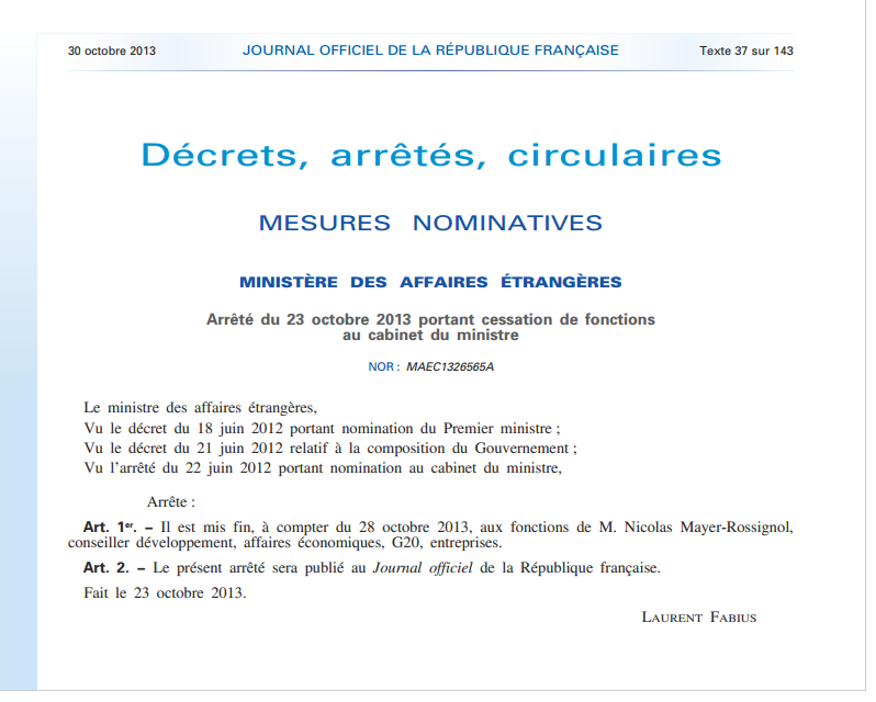 Nicolas Mayer-Rossignol, qui a succédé le 14 octobre dernier à Alain Le Vern à la présidence de la Région Haute-Normandie, n'est plus membre du cabinet de Laurent Fabius, ministre des Affaires étrangères. Un arrêté mettant fin à ses fonctions, signé de Laurent Fabius, a été publié au Journal Officiel mercredi 30 octobre.