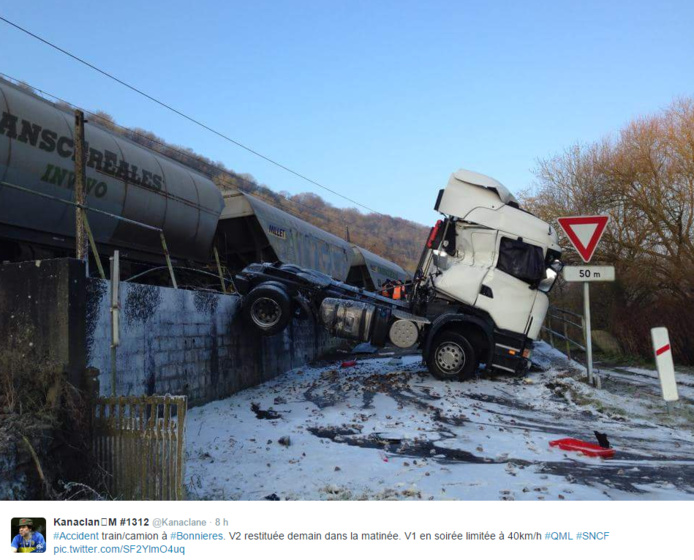 La circulation des trains ne reprendra pas avant ce vendredi, dans la matinée, entre Vernon et Mantes-la-Jolie, sur la ligne Le Havre - Rouen - Paris-Saint-Lazare. La collision qui s'est produite entre un train de marchandise et un semi-remorque ce jeudi peu avant 6 heures, sur un passage à niveau à Jeufosse, près de Bonnières-sur-Seine, dans les Yvelines, a provoqué d'importants dégats aux infrastructures ferroviaires. Plusieurs caténaires ont été endommagées ainsi que les voies.