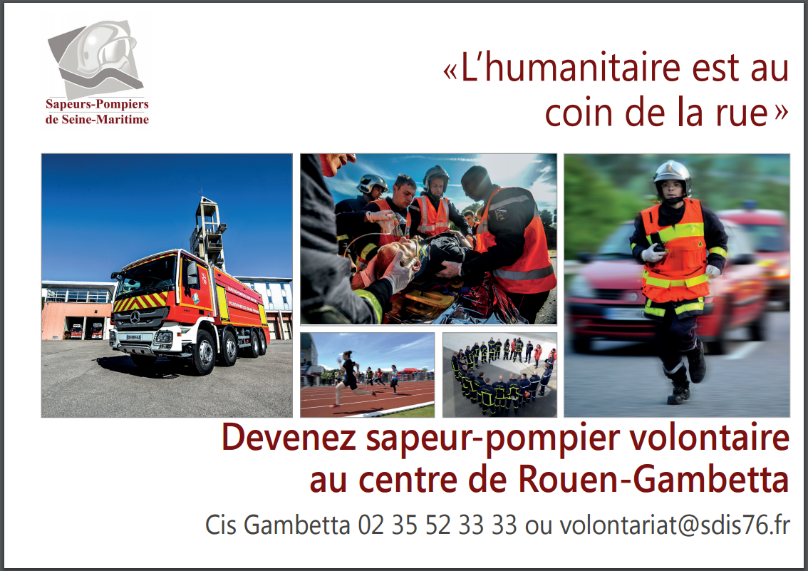Contacts : Cis Rouen Gambetta 02 35 52 33 33 en allant 26 Boulevard Gambetta à Rouen ou par mail : volontariat@sdis76.fr