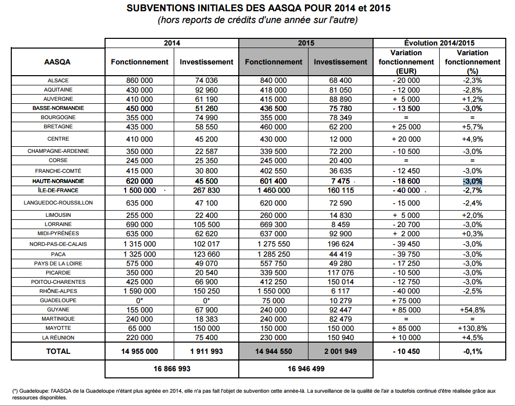 En Ile-de-France, le budget d'Airparif (association de surveillance de la qualité de l'air) est revu également à la baisse de 40 000€ (-2,7%) par rapport à l'année précédente.