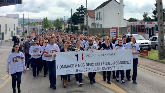 Policiers, gendarmes, pompiers et anonymes... Quelque 2 500 personnes ont participé à une marche blanche ce jeudi matin à la mémoire des deux policiers tués lundi soir à leur domicile à Magnanville (Yvelines). Le cortège a défilé dans un silence absolu du commissariat de police de Mantes-la-Jolie à l'allée des Perdrix à Magnanville, où étaient domiciliés depuis cinq ans Jean-Baptiste Salvaing, sa compagne Jessica Schneider et leur fils Matthieu, âgé de 3 ans et demi.