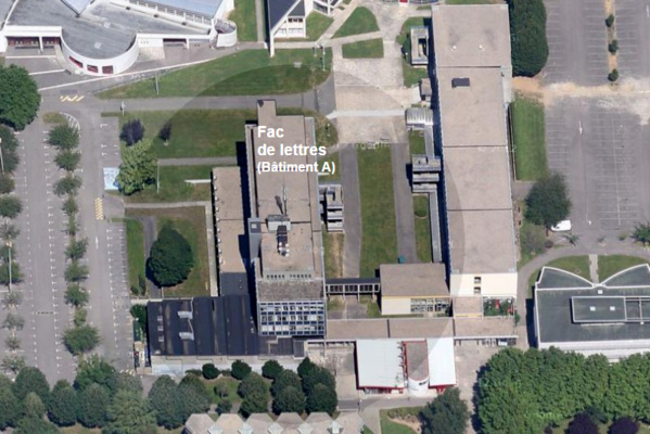 Le corps de l'étudiant a été découvert au pied de la passerelle qui relie le bâtiment A de la fac de lettres à un autre bâtiment (@infoNormandie)
