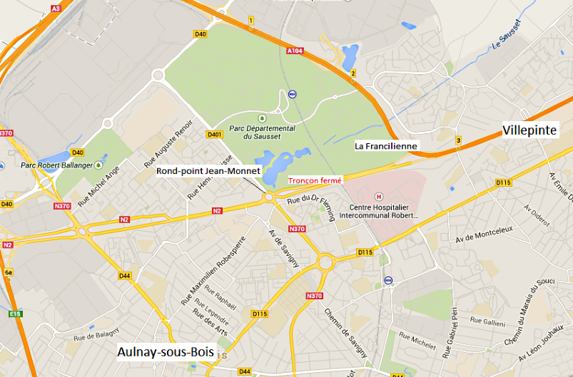 La RN 2 est fermée à partir du rond-point Jean Monnet (Aulnay-sous-Bois) jusqu'à l'entrée de la Francilienne (A104) en direction de Villepinte (Cliquer sur la carte pour l'agrandir)