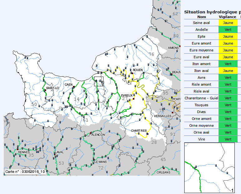 Les niveaux sont en baisse notamment sur la Drouette. L'onde de crue formée par ces apports se propage vers l'aval du tronçon Eure amont, ce qui a conduit à une hausse des niveaux à la station de Charpont au cours de la journée du jeudi 2 juin. Ces niveaux se sont stabilisés au cours de la nuit du jeudi au vendredi 3 juin. La décrue à Charpont devrait intervernir lors de la journée du vendredi 3 juin et devrait être très lente du fait des apports de l'amont du tronçon.