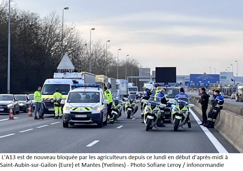 Autre point de blocage : au niveau de Mantes-la-Ville (Yvelines), les manifestants occupent l'A13 dans les deux sens depuis 13 heures. Les usagers doivent quitter l'autoroute après le passage de la barrière de péage de Buchelay pour ceux qui viennent de la Normandie, et à la sortie Mantes Sud pour ceux venant de Paris.