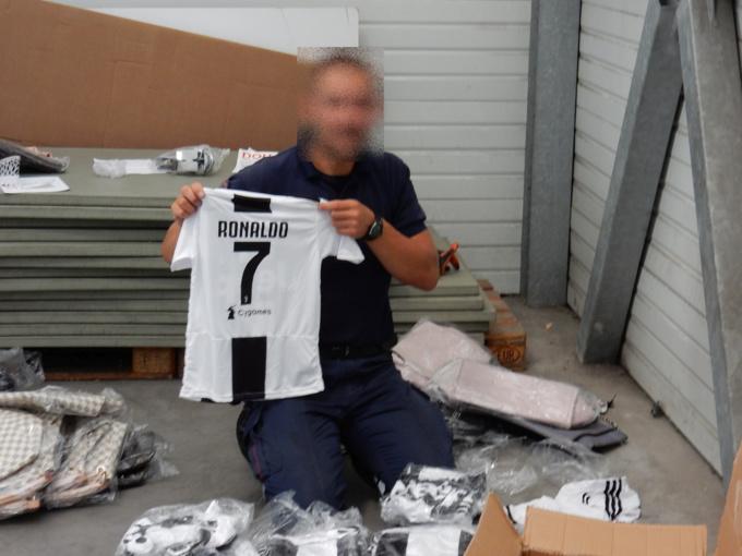 Parmi les articles de sport saisis, se trouvaient des maillots de la Juventus et de l’équipe de basket-ball des Lakers floqués au nom de joueurs dont les transferts ont récemment été annoncés. -Photo © Douane française