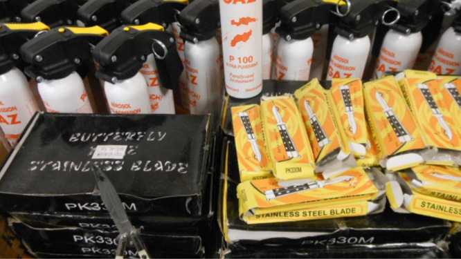 Les douaniers saisissent alors plus de 1.100 couteaux papillons, des bâtons télescopiques électriques et des bombes lacrymogènes de 300 ml. Le gérant n’a pas été en mesure de produire de document justifiant l’acquisition et la détention régulières de ces armes.