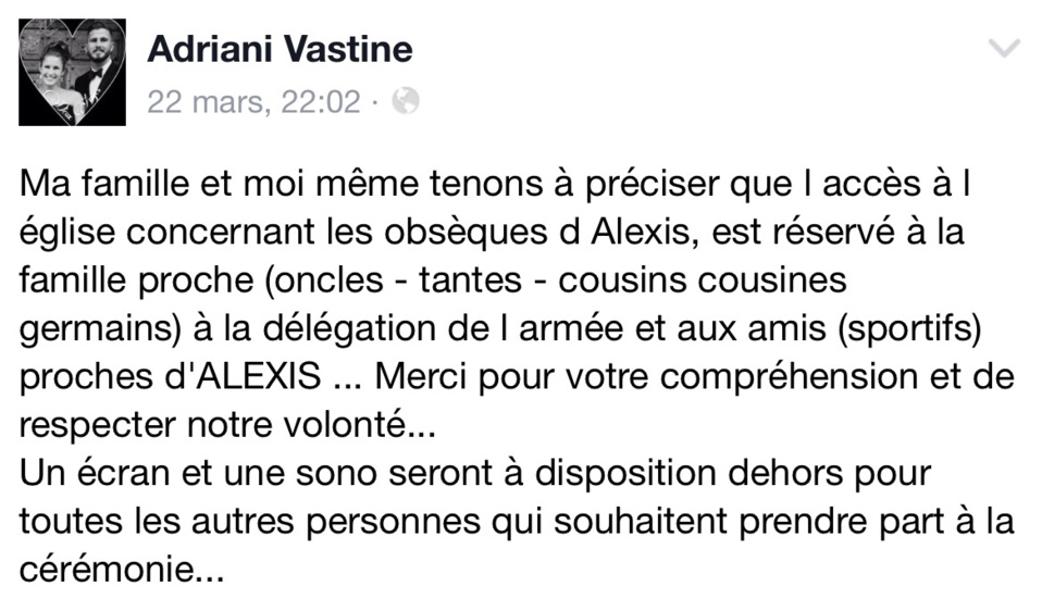 Les obsèques d'Alexis Vastine se dérouleront dans la plus stricte intimité, en présence de Thierry Braillard, Secrétaire d'État aux Sports auprès du ministre de la Ville, de la Jeunesse et des Sports, mercredi 25 mars à 15 heures.
