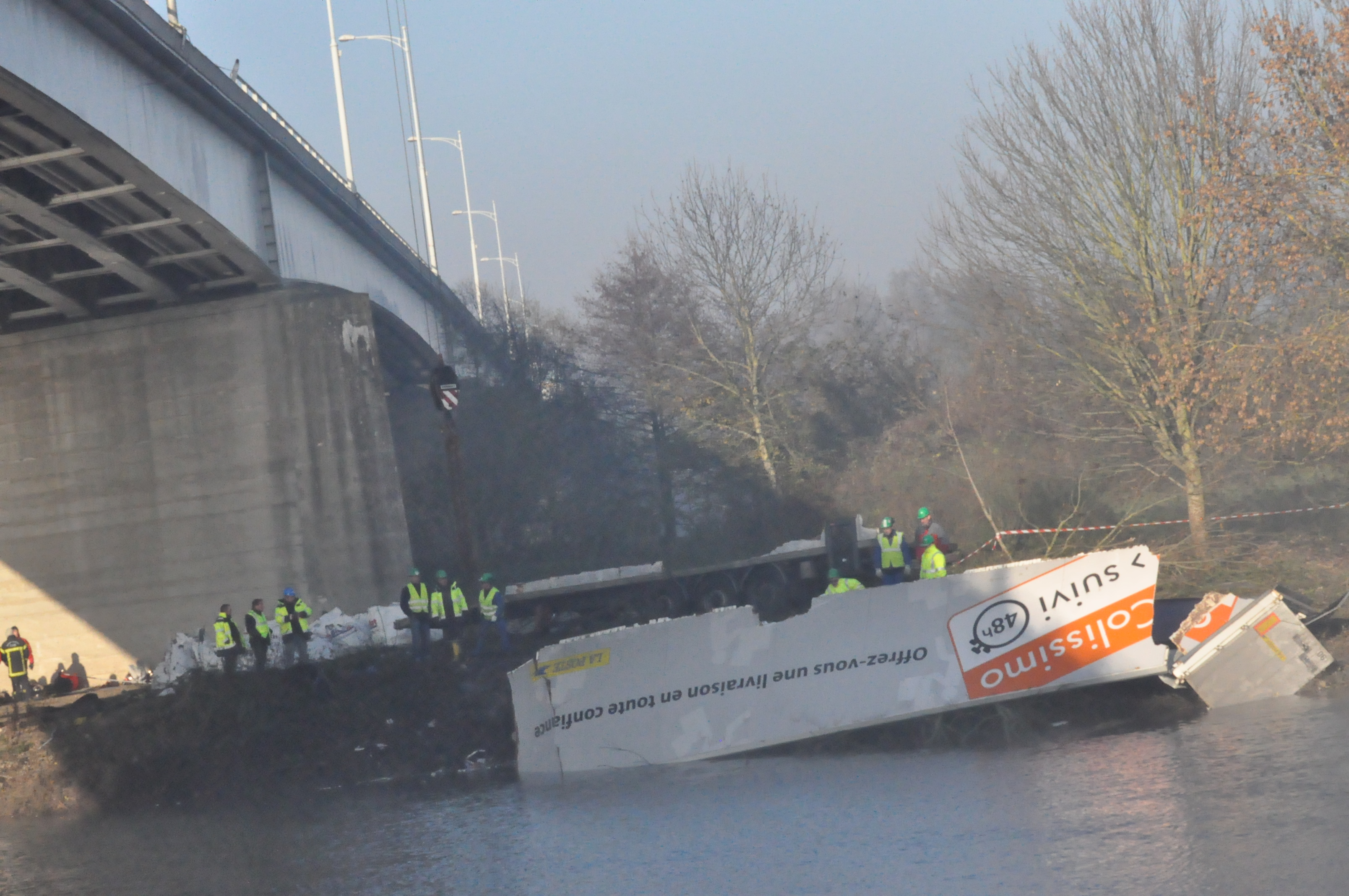 Le poids lourd chargé de colis postaux, qui venait de Rouen, traversait le pont de la Seine avant Pont de l'Arche lorsqu'il a glissé sur la route verglacée. Il s'est déporté sur la gauche et a défoncé le parapet, chutant en contrebas (@Infonormandie)
