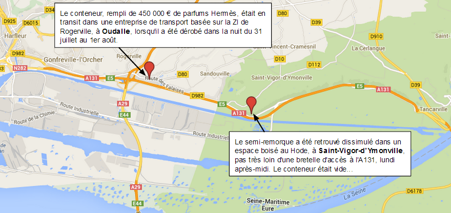 INFO infoNormandie.com. Les malfaiteurs étaient bien renseignés. Ils savaient assurément que le conteneur qu'ils venaient chercher était rempli de parfums de luxe de grandes marques, comme Hermès et quelques autres. Le montant du préjudice est en cours d'évaluation, mais il est d'ores et déjà estimé à près de 450 000€ !, selon nos informations.