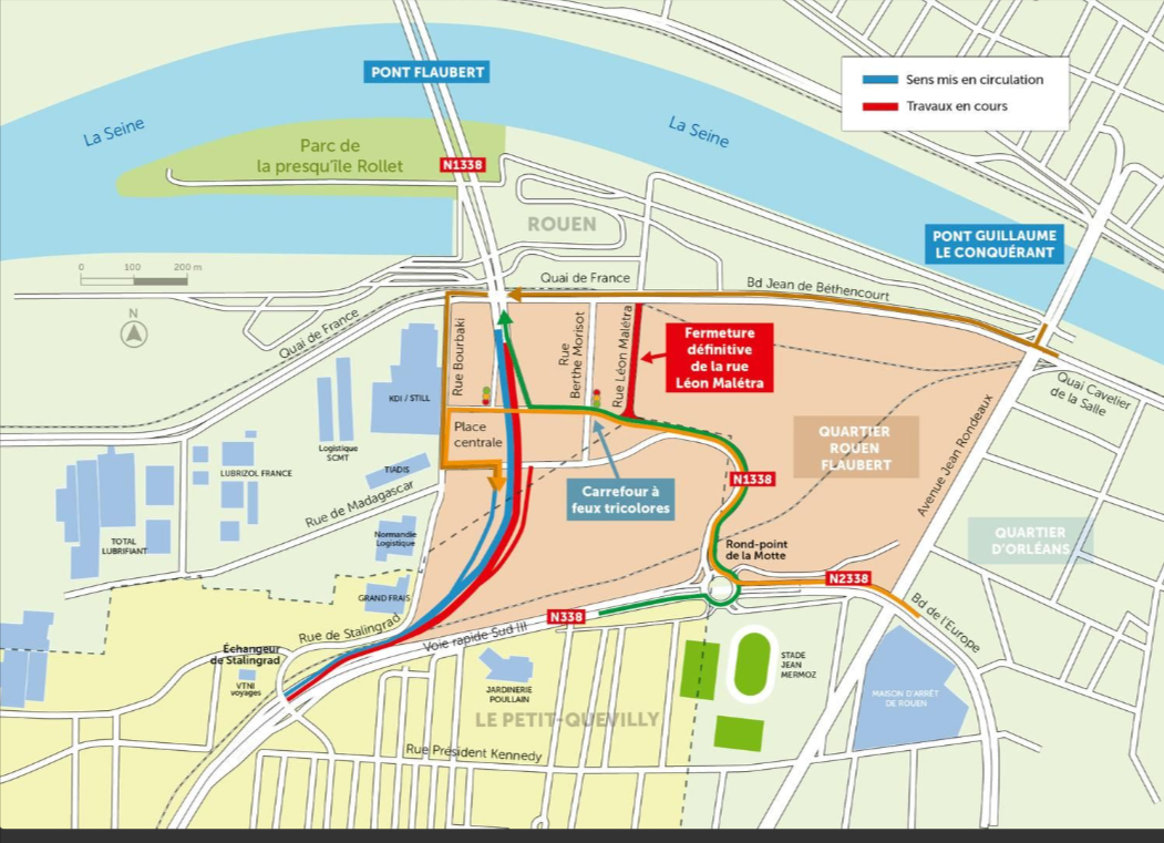 emprunter les itinéraires présentés ci-dessus. Les véhicules légers provenant de la voie rapide Sud III peuvent emprunter l'itinéraire vert pour rejoindre le pont Flaubert