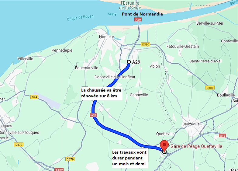 La Société des autoroutes du Nord et de l'Est de la France (Sanef) annonce la rénovation des chaussées de l'autoroute A29, dont elle est concessionnaire, entre la barrière de péage de Quetteville et la sortie n°3 La Rivière-St-Sauveur (Calvados), dans les deux sens de circulation. Les travaux débuteront le lundi 23 septembre et dureront un mois et demi.