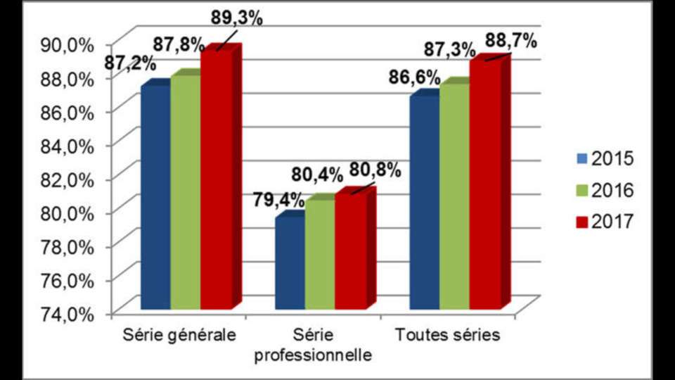 Le taux de réussite s’élève à 89,3% pour la série générale (soit 1,5 point de plus qu’en 2016) et à 80,8% pour la série professionnelle (soit 0,4 point de plus qu’en 2016).