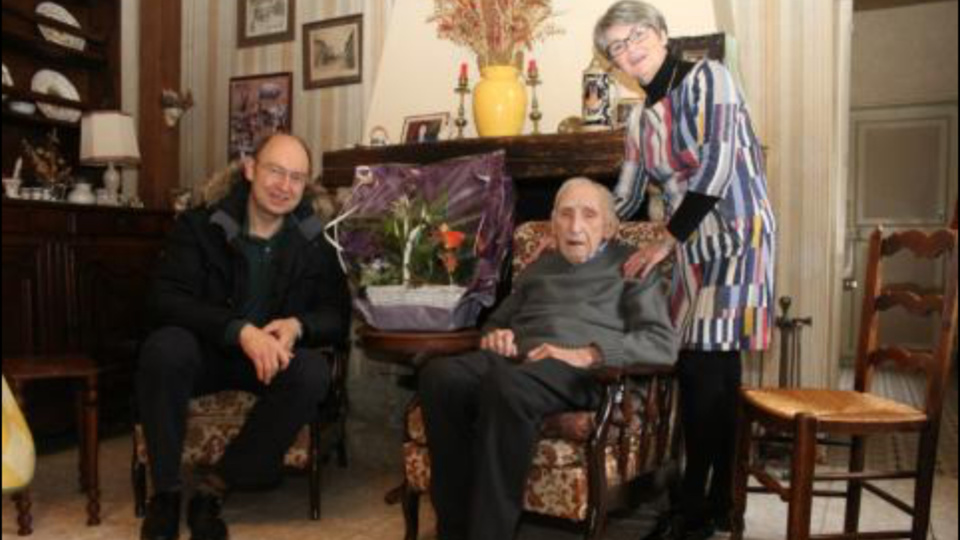 Michel Vialay, maire de Mantes-la-Jolie et son adjointe en charge des seniors, Nadine Wadoux, avaient rendu visite à Roger Clérisse pour lui souhaiter son anniversaire, le jour de ses 108 ans (Photo@Mantes-la-Jolie.fr)