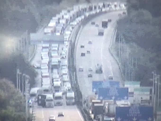 Le blocage de l'A13 par les forains a généré d'importants bouchons dans les deux sens de circulation (photo publiée par Sanef sur son compte Twitter)