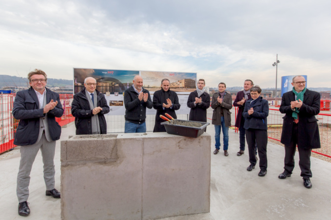 La première du Hangar 107, situé sur la rive gauche entre le pont Flaubert et le pont Guillaume Le Conquérant, a été posée aujourd'hui jeudi. Cette opération d'un coût de 10 millions d'euros, prévoit la construction d'un bâtiment qui abritera à terme, outre des entreprises, un café concert, un restaurant, un espace d'exposition, une conciergerie et une crèche. Livraison prévue en septembre 2017.