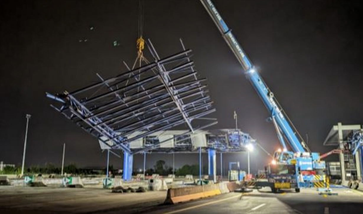 Après l'auvent du péage d'Heudebouville, c'est le tour de celui d'Incarville de disparaître du payasage autoroutier - Photo Sanef