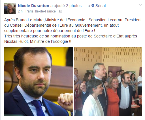 Sébastien Lecornu, président du conseil départemental de l'Eure (Les Républicains), proche de Bruno Le Maire, confirmé dans ses fonctions de ministre de l'Economie, est nommé secrétaire d'Etat auprès du ministre de la Transition écologique (Nicolas Hulot) dans le gouvernement Philippe II.