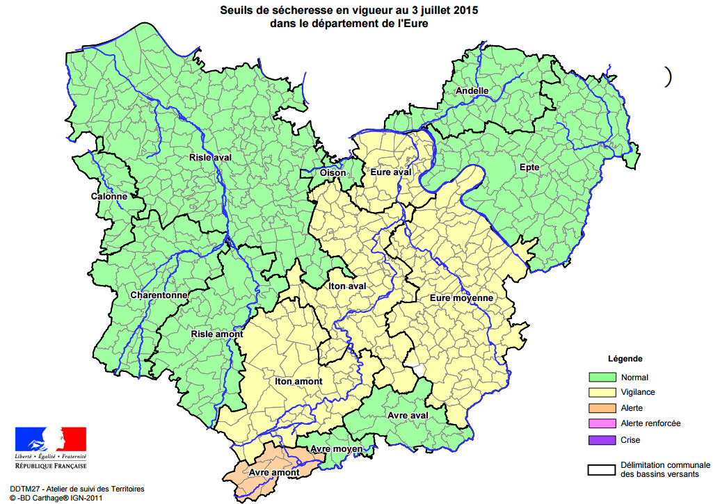 Le déficit de précipitations en juin a conduit les débits de certains cours d’eau à chuter fortement. Au niveau des nappes phréatiques, indique la préfecture de l'Eure, la recharge hivernale permet de maintenir des cotes piézométriques satisfaisantes à l’exception de l’Eure moyenne. Ainsi, les bassins de l’Iton, l’Eure et l’Avre sont principalement touchés.