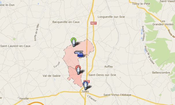 L'hélicoptère de la gendarmerie a survolé ce samedi entre 11 h et 13 h les communes de Beauval-en-Caux et de Calleville-les-Deux-Eglises (zone en rose) au nord de Tôtes