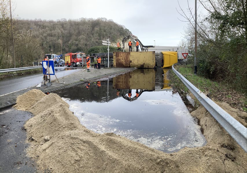 Les sapeurs-pompiers ont posé un perlon de terre et de sable afin de contenir sur place le produit qui s'est répandu sur la route - Photo © Sdis76