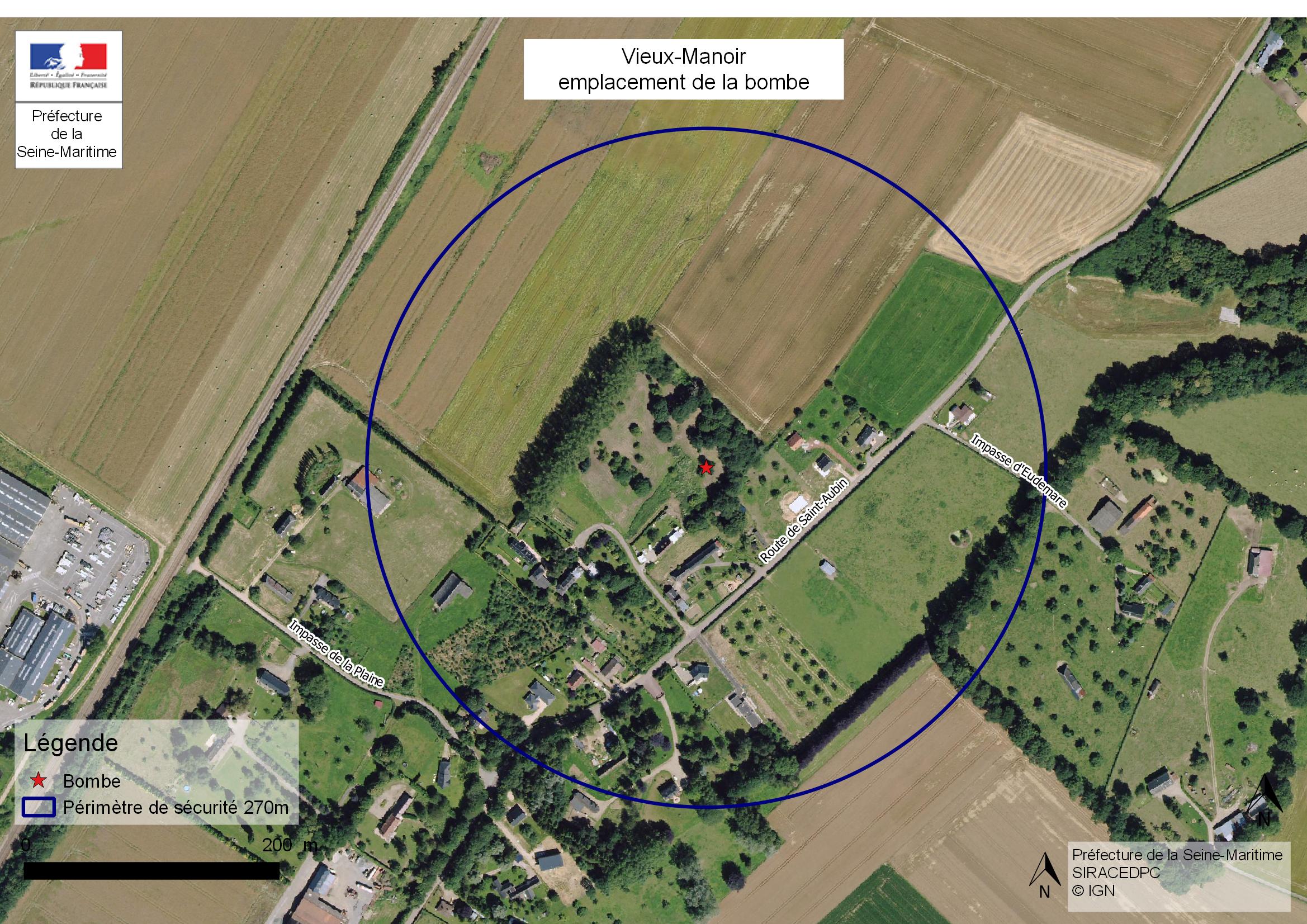 Une bombe américaine de 100 livres contenant 26 kg d’explosifs a été découverte sur la commune de Vieux-Manoir, au nord-est de Rouen (Seine-Maritime). Elle est en position horizontale et recouverte de 10 m³ deterre meuble.