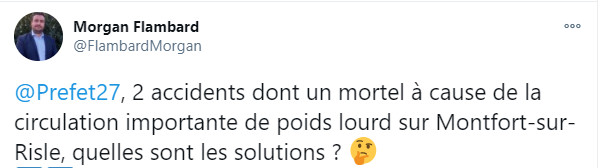 Après cette tragédie, nul doute que la question de la déviation de Monfort-sur-Risle, réclamée depuis quarante ans, selon Morgan Flambard, responsable politique local, devrait revenir au coeur du débat. En particulier, en raison du trafic, tout spécialement des camions, qui ne cesse de s'accroître sur cet axe qui relie Pont-Audemer et l'autoroute A28, via Brionne.