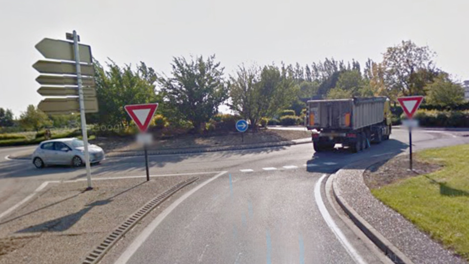 Le poids-lourd est allé tout droit et s'est immobilise en portefeuille sur le terre-plein du rond-point (illustration@Google Maps)
