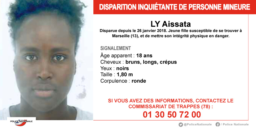 Aissata Ly a disparu depuis depuis le 26 janvier dernier. « Elle est susceptible de se trouver dans la région de Marseille (Bouches-du-Rhône) et de mettre son intégrité physique en danger ».