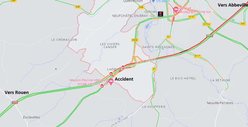 Un véhicule de la direction interrégionale des routes nord-ouest (Dirno) a été percuté par une voiture sur l'autoroute A28 à hauteur de la sortie n°9 (vers la D928) dans le sens Rouen vers Abbeville. La collision est survenue dans des circonstances qui restent à établir un peu avant 10h30, à hauteur de Quièvrecourt (Seine-Maritime).