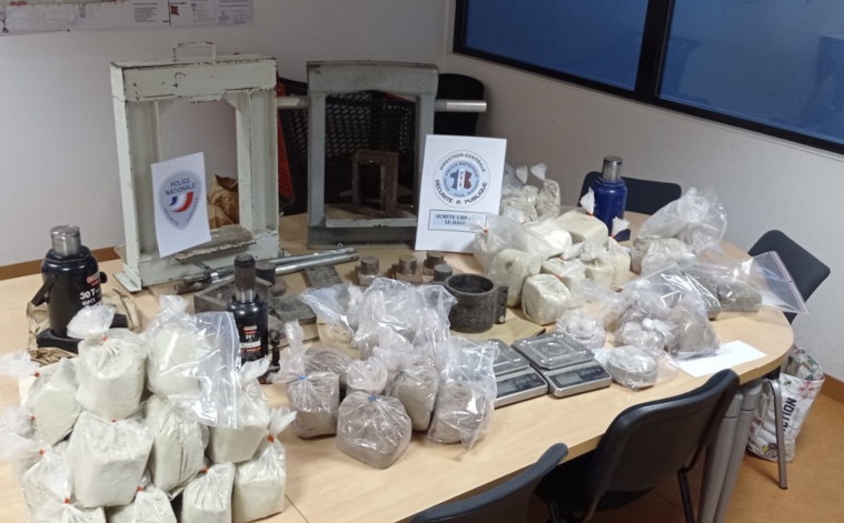 Hier, saisie de 13 kgs d'héroïne, 1,6 kgs de résine de cannabis, 37 kgs de produit de coupe, 2 presses et divers matériels en lien avec le conditionnement.