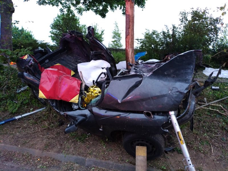 Trois jeunes gens de 20 et 22 ans se trouvaient à bord de cette voiture complètement disloquée après avoir percuté un arbre avenue des Canadiens à Saint-Étienne-du-Rouvray - Photo @ Sdis76
