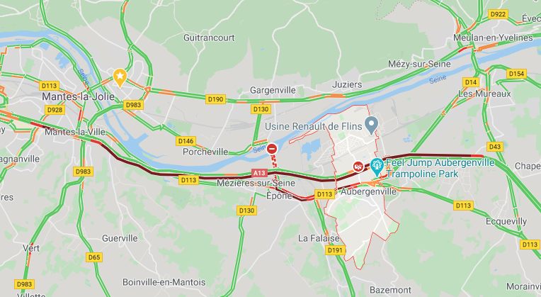 Un bouchon s'est formé entre Mantes-est et la bretelle de sortie de Flins-sur-Seine/Aubergenville. Le trafic est également stoppé dans l'autre sens, à partir de Chapet.