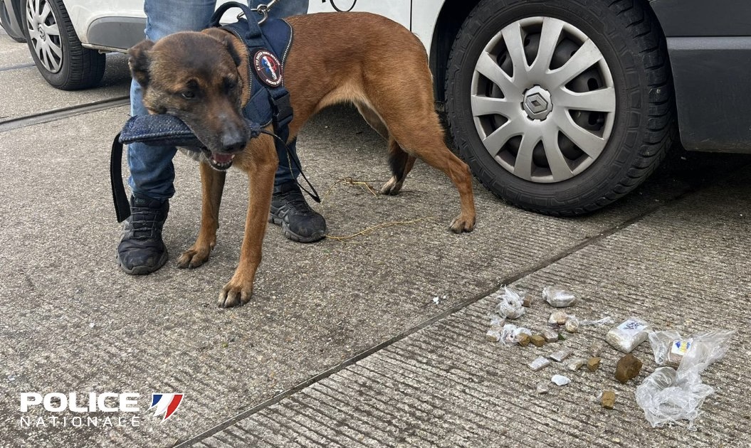 Le chien spécialisé dans la recherche de stupéfiants a débusqué 300 g de résine de cannabis dissimulées dans des arbustes - Photo @ DIPN/X