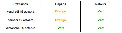 Vendredi 18 octobre, la circulation sera délicate en milieu urbain en raison des nombreux bouchons liés à l’activité économique et aux trajets domicile-travail des jours de semaine. Pour quitter Paris et la région parisienne, des difficultés sont attendues plus particulièrement au niveau de deux zones de chantier, l’une sur A6 au sud d’Evry et l’autre sur A10 au niveau de Saint-Arnoult-en-Yvelines.