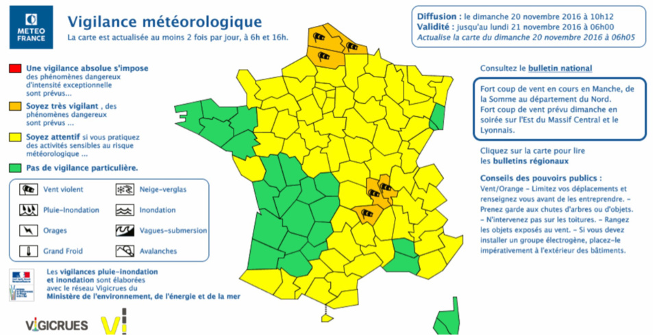 L'ensemble des départements Normands, dont la Seine-Maritime, l'Eure et le Calvados sont repassés ce dimanche matin en vigilance jaune. Six départements , notamment ceux des départements du Nord, Pas-de-Calais et la Somme sont maintenus en orange.